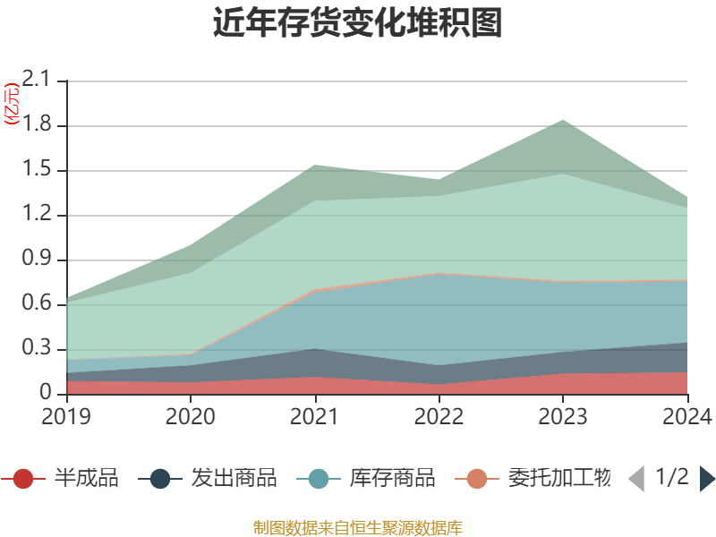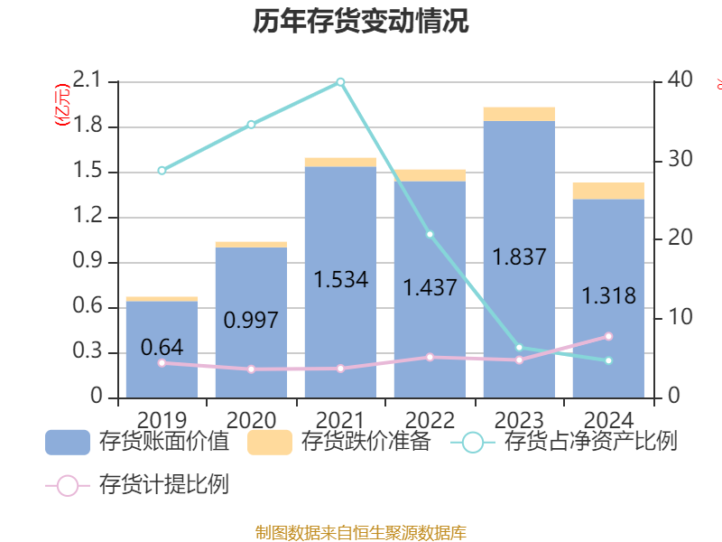 从存货变动来看,截至2024年末,公司存货账面价值为1.32亿元,占净资产的4.66%,较上年末减少5196.32万元。其中,存货跌价准备为1104.16万元,计提比例为7.73%。