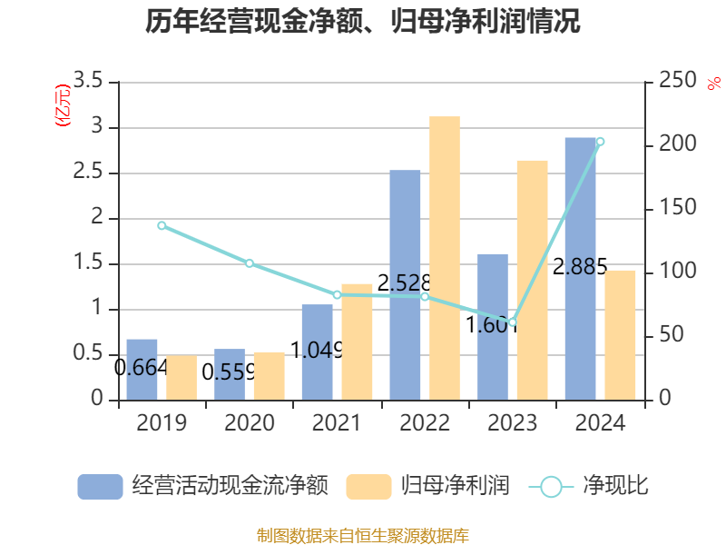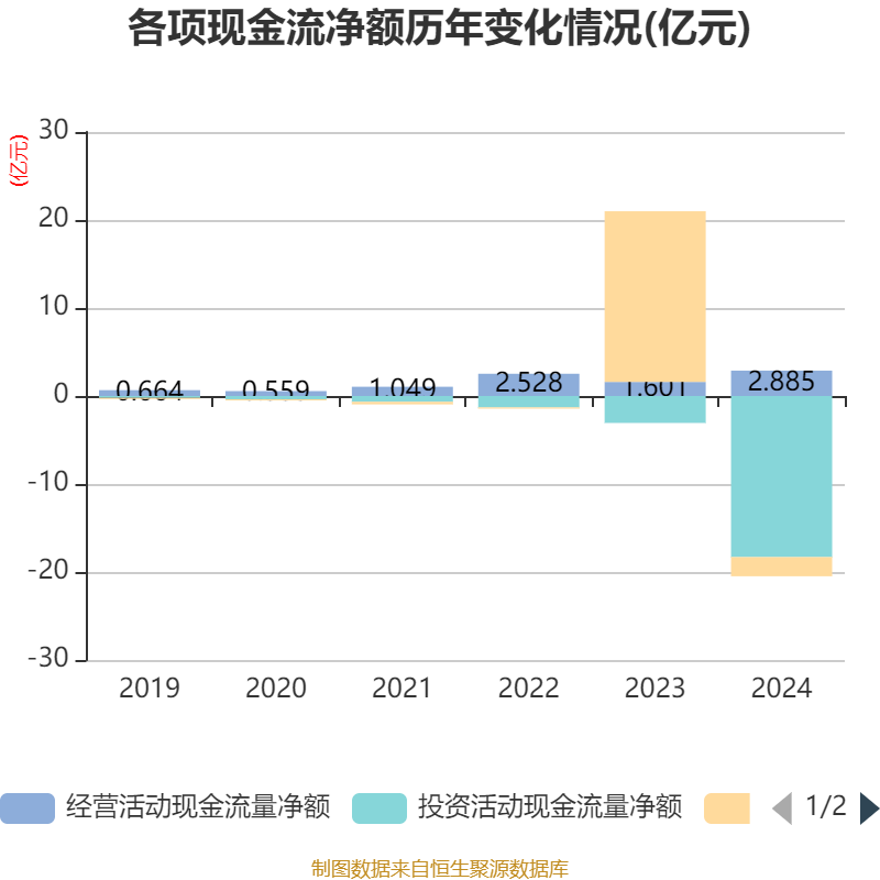 截至2024年,公司经营活动现金流净额为2.88亿元,同比增长80.19%;筹资活动现金流净额-2.18亿元,同比减少21.57亿元;投资活动现金流净额-18.31亿元,上年同期为-3.06亿元。
